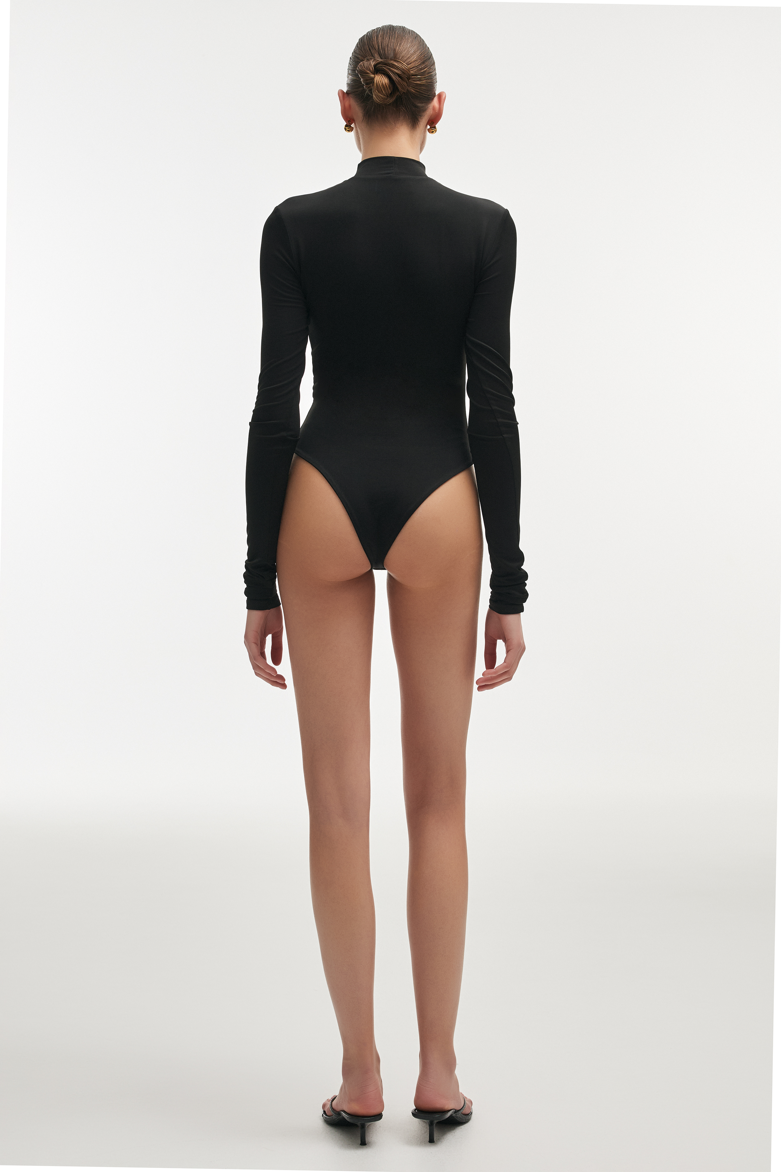 • Cut in a close-fitting shape with a high neckline and long sleeves, it creates a sleek, elongated line.